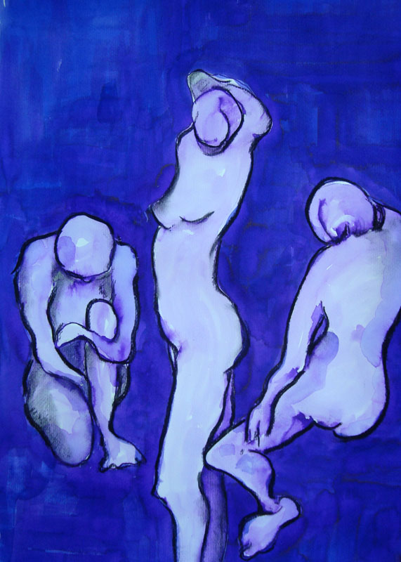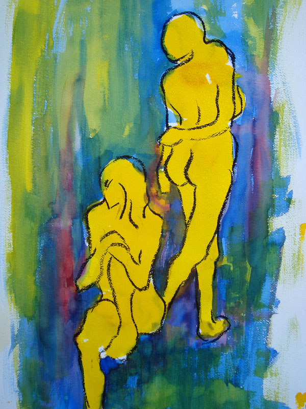 - Using printing inks in a painterly way and combining them with charcoal drawing as in ‘Three Figures on Purple Background’ and ‘Two Figures on Yellow Background’ in the Life Drawing section.